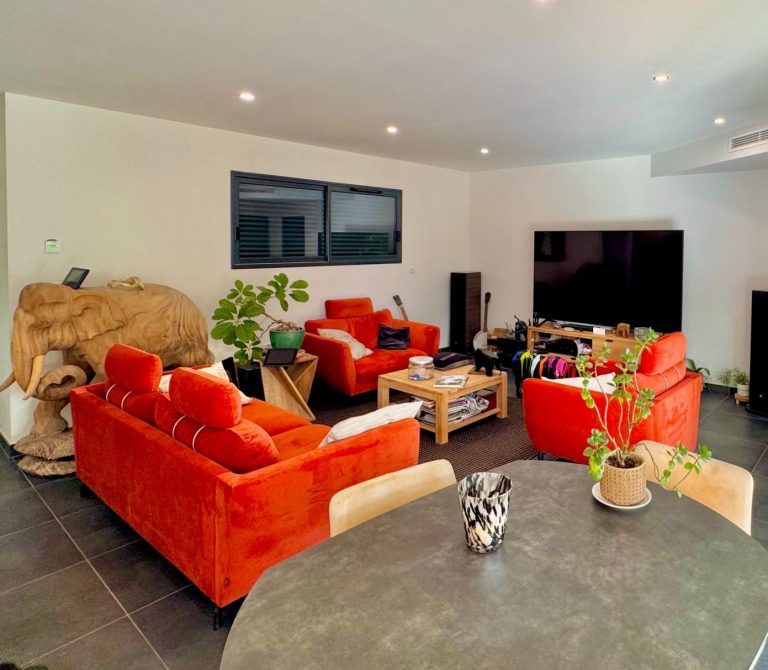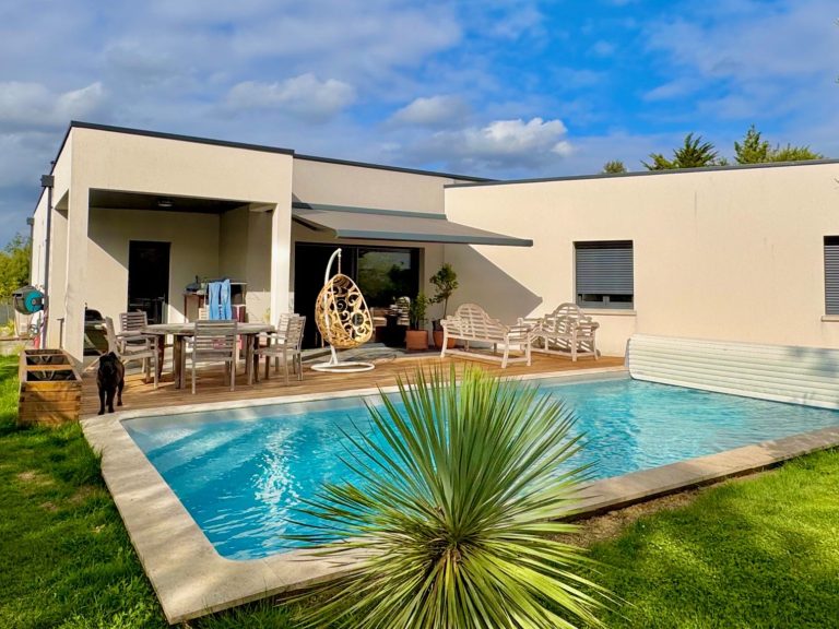 À l’extérieur, la piscine s’intègre harmonieusement dans un jardin clos, arboré et facile d’entretien. L’ensemble constitue une villa clé en main, sans travaux, économe et respectueuse de l’environnement.