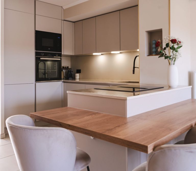 plaque de cuisson, hotte intégrée, îlot central, réfrigérateur encastré, four et micro-ondes intégrés, avec de nombreux rangements. Un espace fonctionnel et convivial.